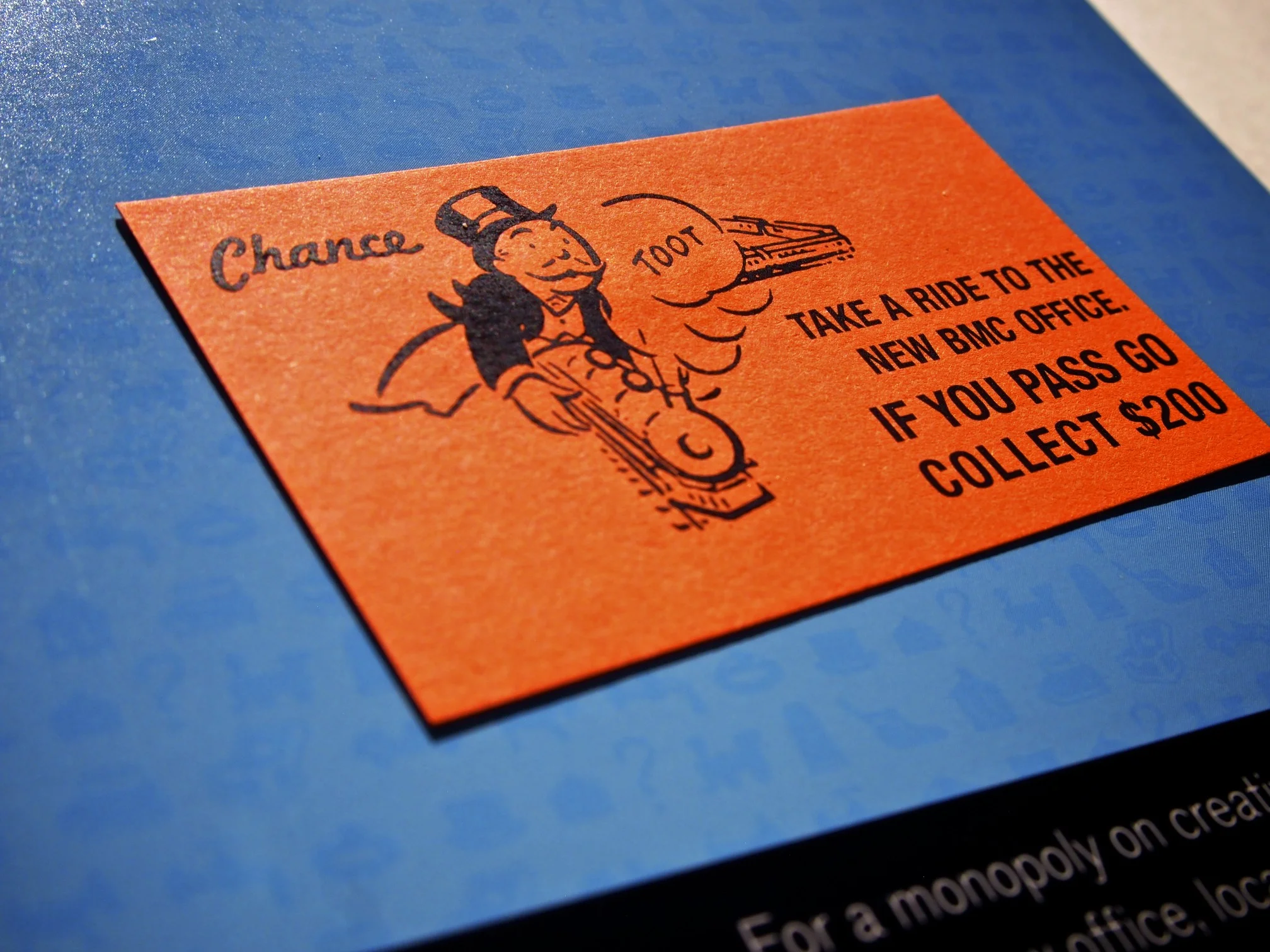 I wrote this announcement when the agency I worked for moved to new digs "high atop the Old Train Station." The cover featured a modified Chance card, while the copy incorporated all the tokens from a traditional Monopoly game. Think we missed one? Check the back.